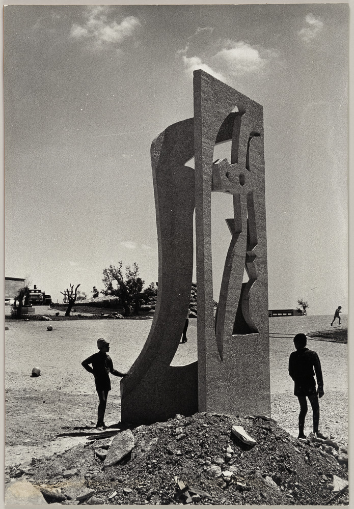 Sculpture en ciment blanc et galets clairs "Figure" de 1967, avec deux enfants autour, jardin du musée d'Israël, Jérusalem