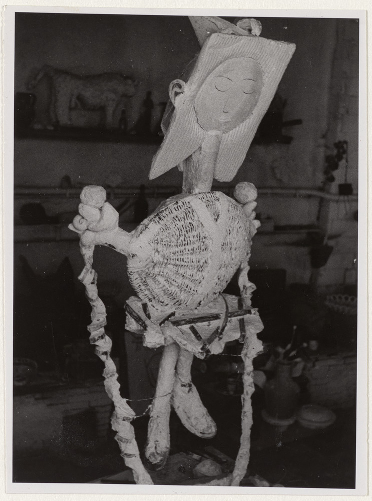 Sculpture en plâtre et autres matériaux "Petite fille sautant à la corde", dans l'atelier du Fournas, Vallauris, en 1950