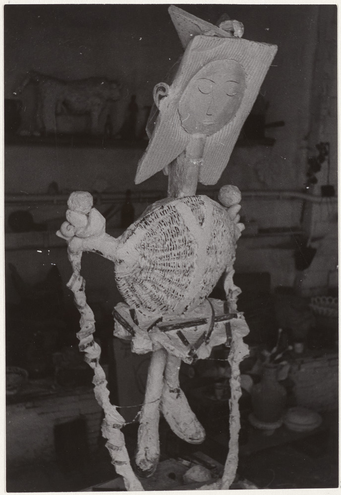 Sculpture en plâtre et autres matériaux "Petite fille sautant à la corde", dans l'atelier du Fournas, Vallauris, en 1950
