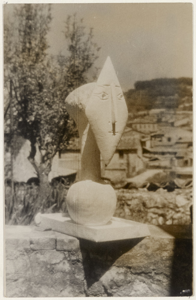 Sculpture en plâtre et terre cuite "Tête de femme", dans la cour de l'atelier du Fournas, Vallauris, vers 1951