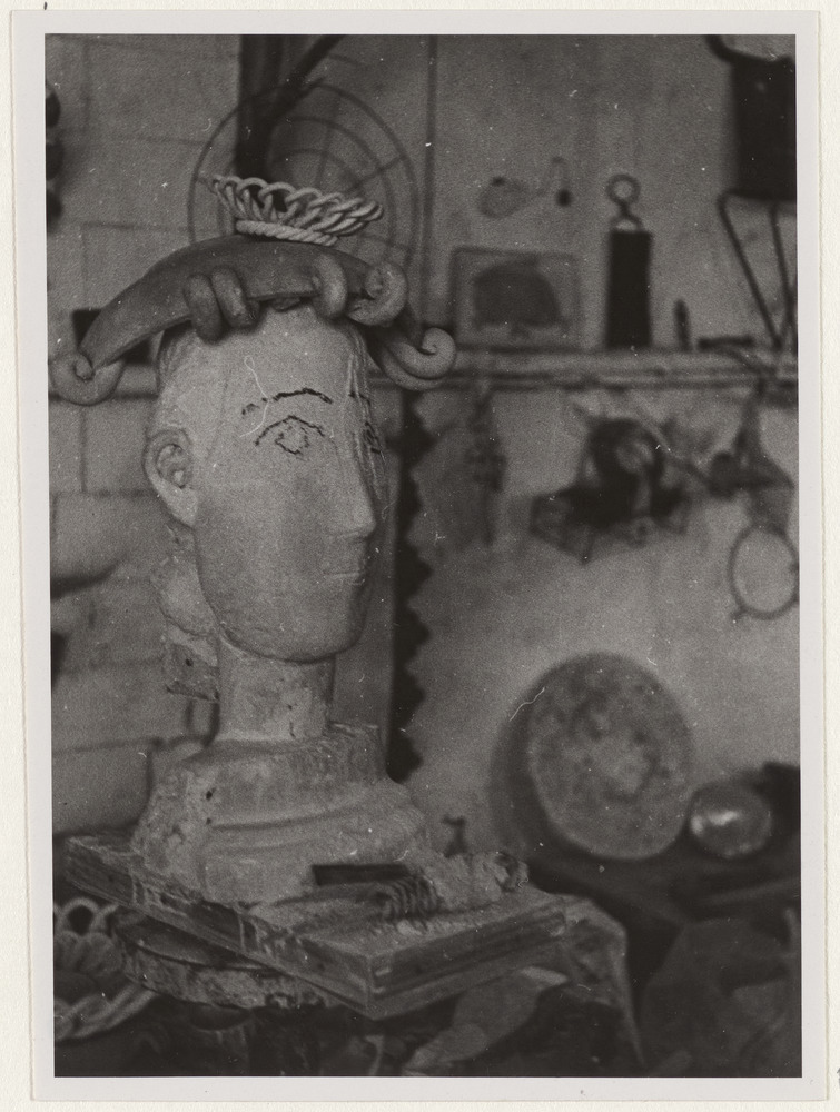 Sculpture en plâtre et terre cuite "Tête de femme" surmontée d'une corbeille et d'un moulage en plâtre, dans l'atelier du Fournas, Vallauris, vers [1951]