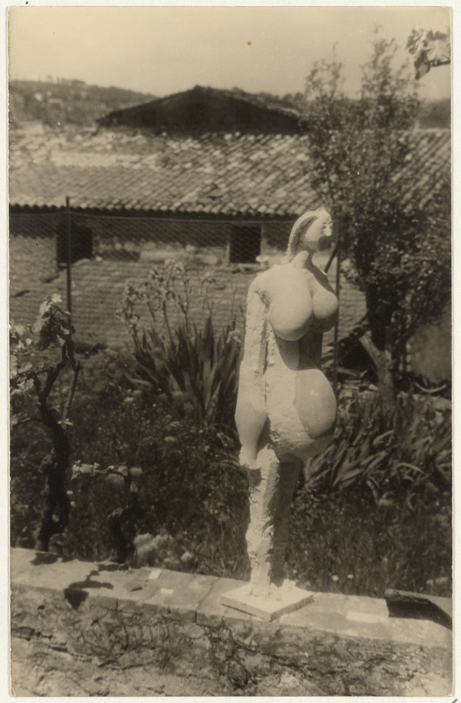 Sculpture en plâtre "Femme enceinte" sur un muret de la cour de l'atelier du Fournas, Vallauris, le 06 mai 1950