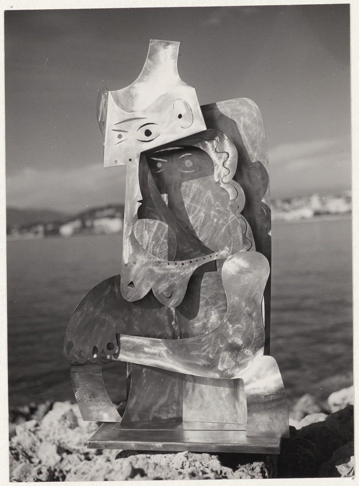 Sculpture en tôle découpée et pliée "Femme au chapeau" posée sur un rocher au bord de la mer, [Cannes, vers 1961]