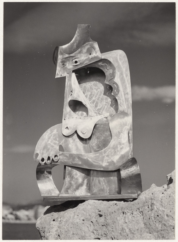 Sculpture en tôle découpée et pliée "Femme au chapeau" posée sur un rocher au bord de la mer, [Cannes, vers 1961]
