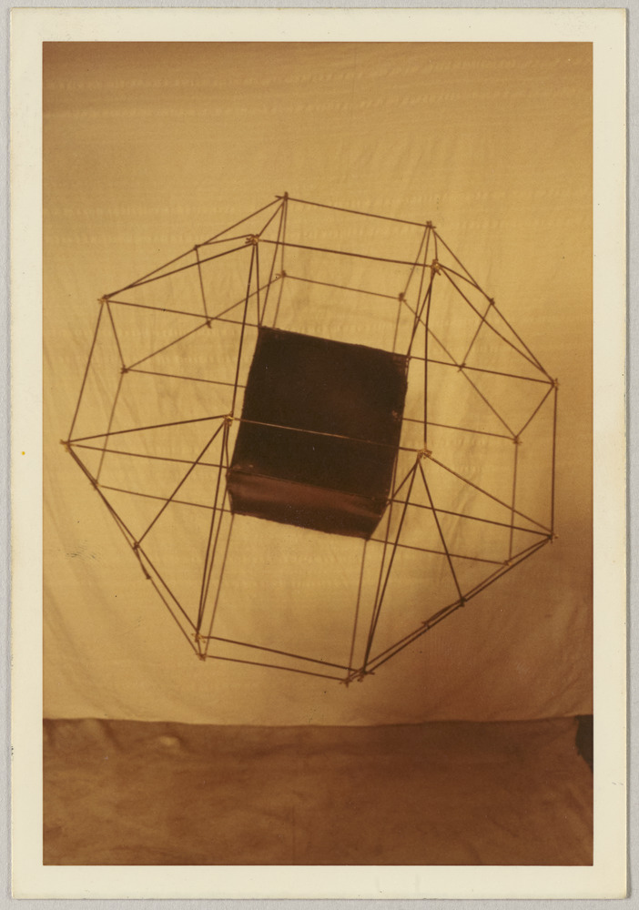 Annotation manuscrite au dos, centrée : "Just something to walk into '69' Steel wire tin brazed hight 36" width 36" depth 36""