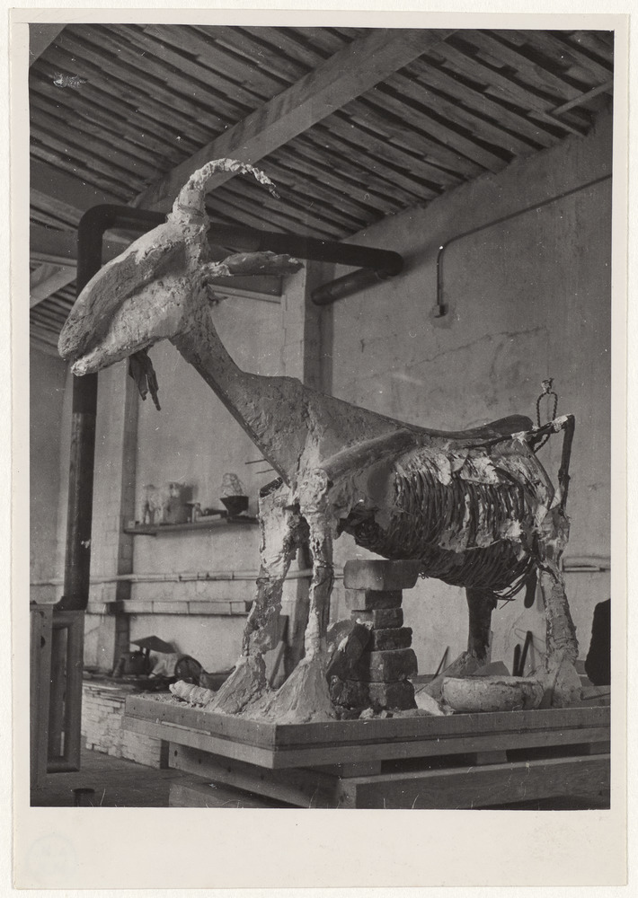 Sculpture "La Chèvre" en cours de réalisation dans l'atelier du Fournas, Vallauris, en 1950