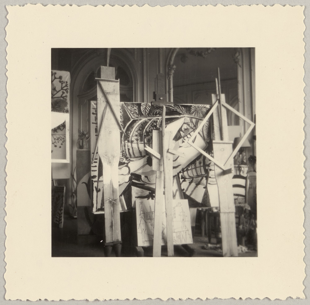 Présent sur la photographie le dessin "Étude pour "Les baigneurs": le tremplin" (MP1513 recto), à gauche de la photographie, un bout de la toile "Les enfants" et en arrière-plan à droite, la "Chaise-palette" (MP3671)