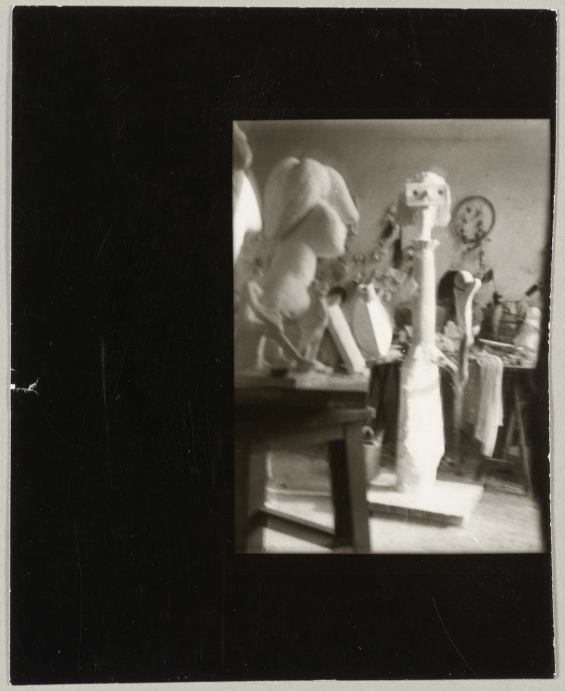 Sculptures en plâtre "Femme à l'orange", "Buste de femme", "Femme assise" dans l'atelier de Boisgeloup, Gisors, circa 1934