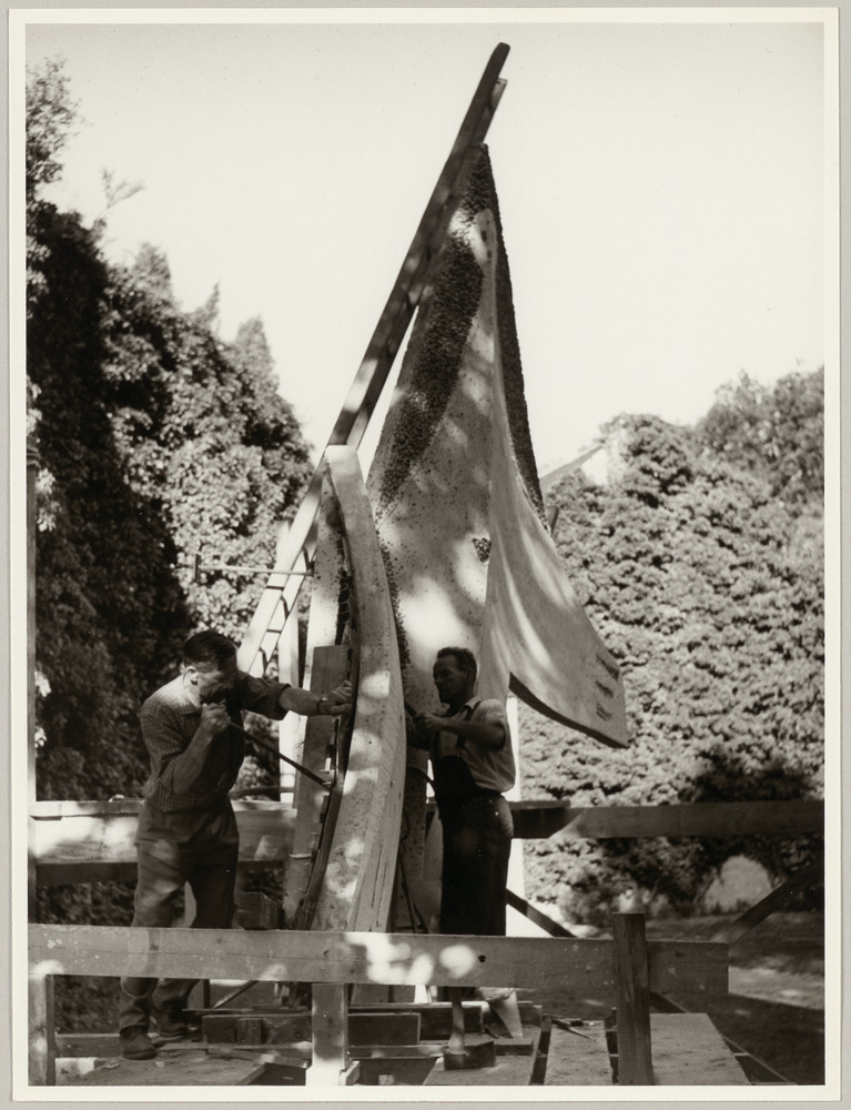 Sigurd Frager et Cameron pendant le décoffrage du bras de la sculpture "Femme aux bras écartés", prieuré St-Hilaire, Chalo-Saint-Mars, en 1962