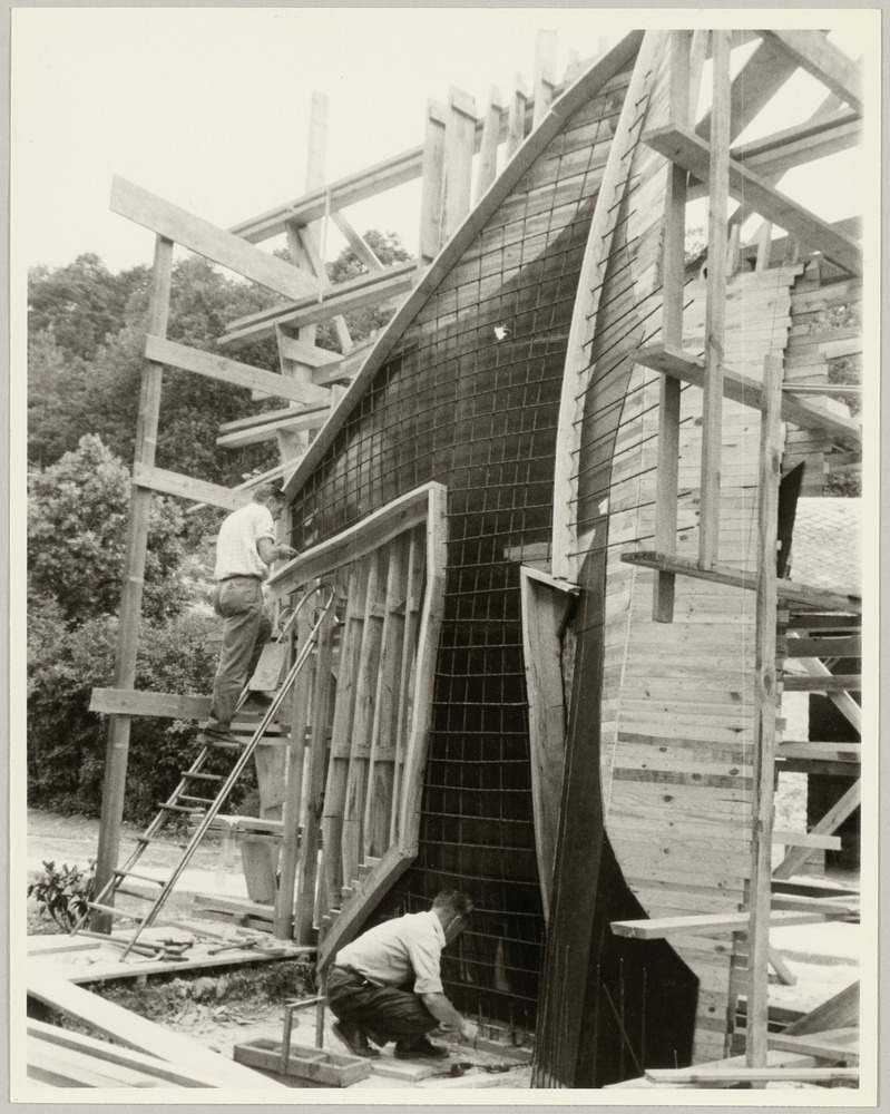 Sigurd Frager et [Cameron] travaillant à la pose des fers pour le coffrage de la sculpture "Femme aux bras écartés", parc du prieuré de Saint-Hilaire, Chalo-Saint-Mars, en 1962