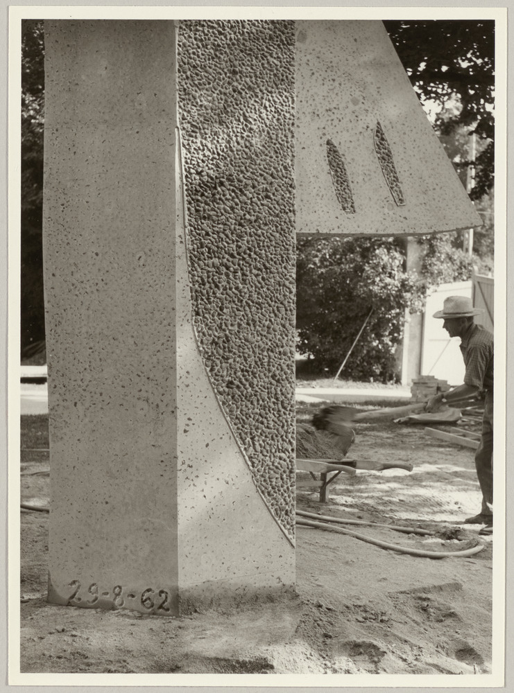 Sigurd Frager jetant une pelletée de terre au pied de la sculpture en bétogravure "Femme aux bras écartés", prieuré St-Hilaire, Chalo-Saint-Mars, en 1962