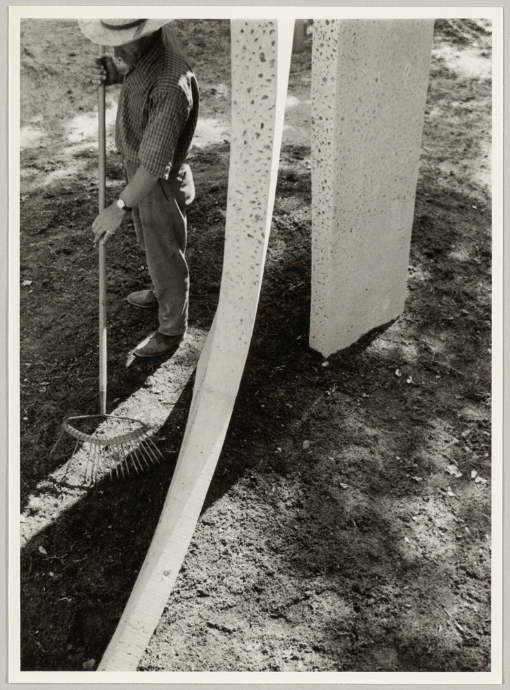 Sigurd Frager ratissant au pied de la sculpture "Femme aux bras écartés", prieuré St-Hilaire, Chalo-Saint-Mars, en 1962