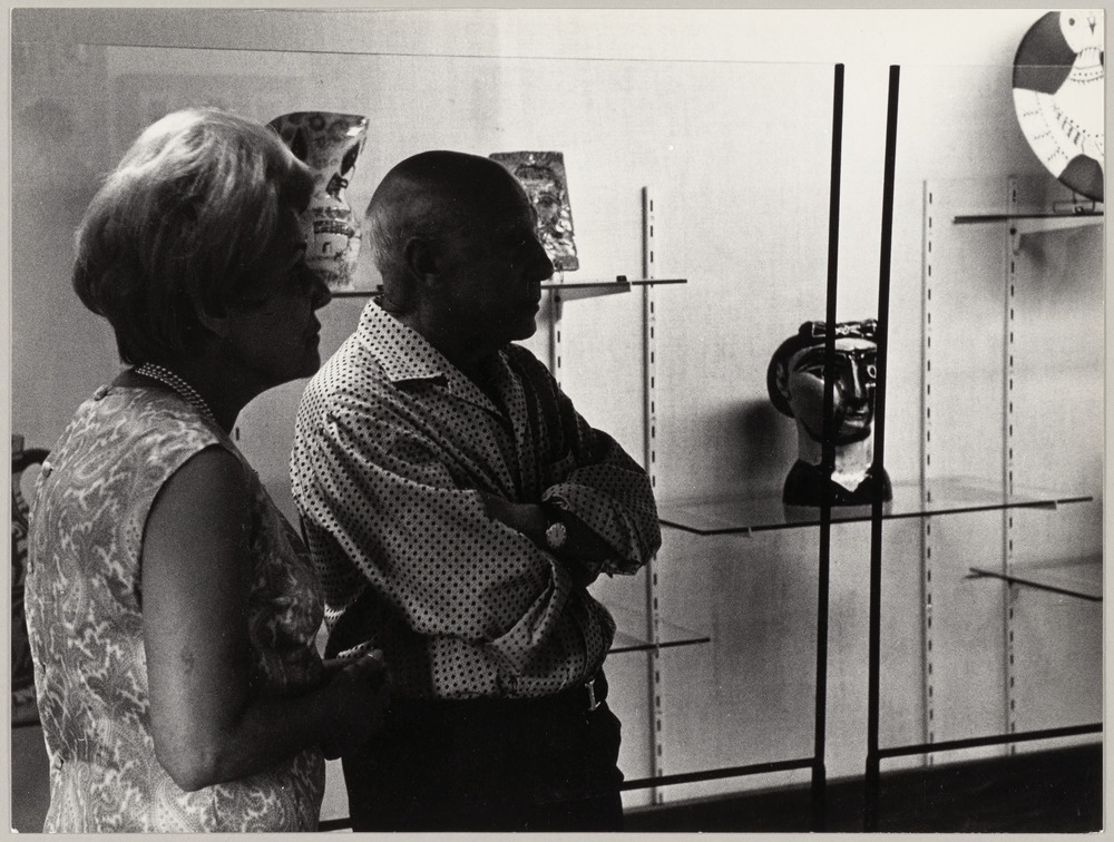 Suzanne Ramié et Pablo Picasso à côté des céramiques peintes exposées dans l…