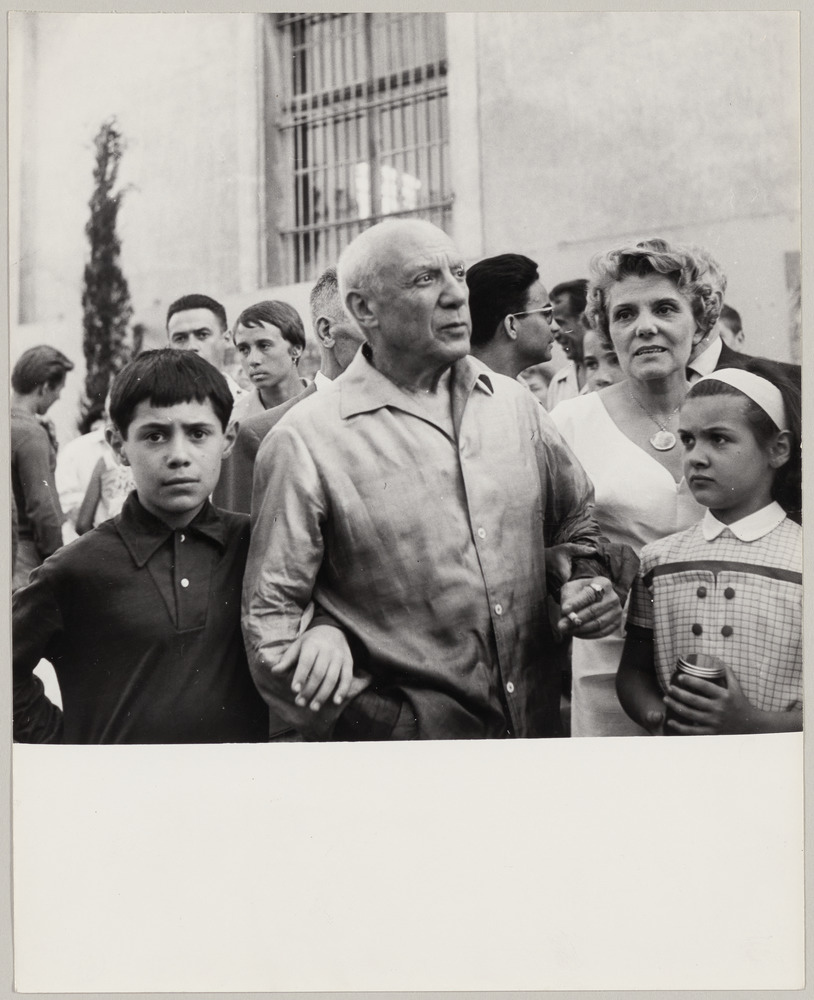 Suzanne Ramié, Pablo Picasso et ses enfants, Claude et Paloma, lors du vernissage de l'exposition "Céramiques" au Nérolium, Vallauris, en mars-avril 1958