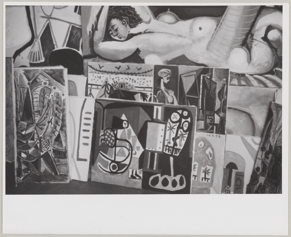 Toiles superposées "Femme dans l'atelier", "Corrida", "L'atelier" et "Femme nue allongée" avec d'autres toiles dans l'atelier de La Californie, Cannes, vers [1956]
