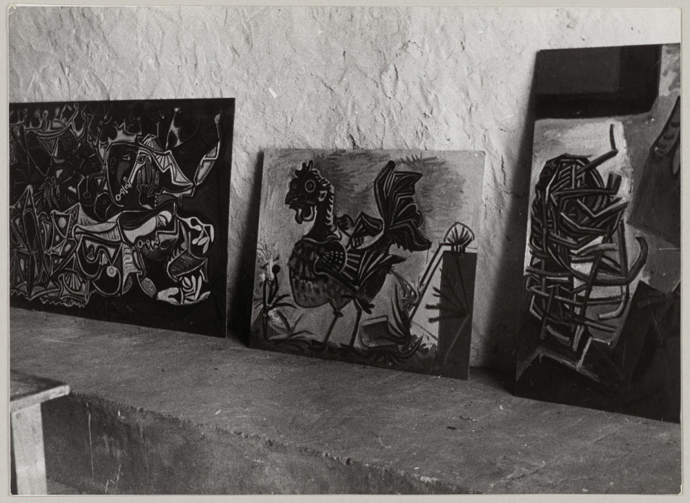 Trois huiles sur contreplaqué contre un mur : "Les demoiselles des bords de Seine d'après Courbet", huile sur contreplaqué, "Poule", 1950 et une huile sur contreplaqué "Coq et panier d'osier", 1950