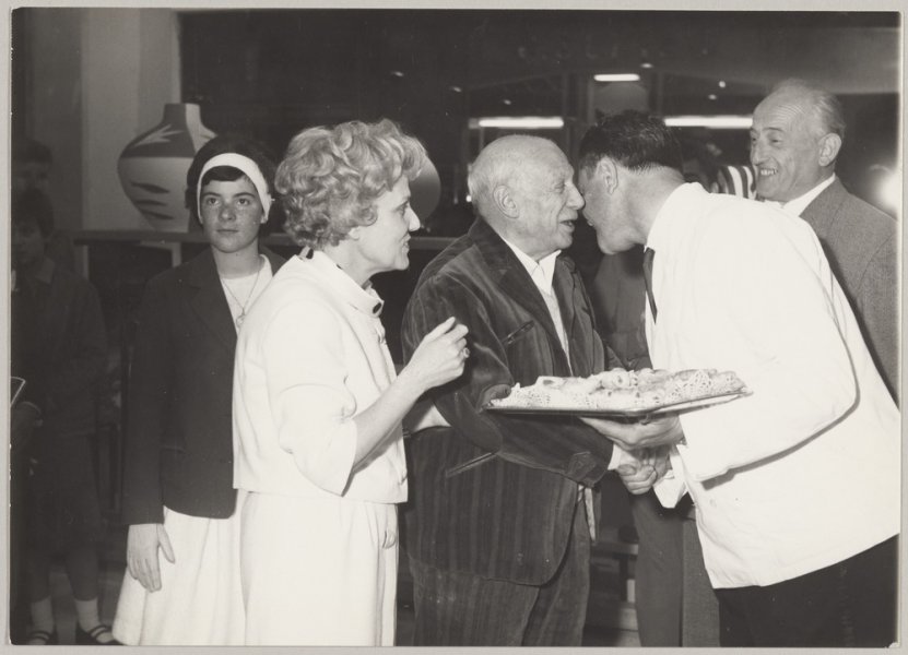 Un serveur serrant la main de Pablo Picasso, Suzanne Ramié, Georges Ramié lors de l'inauguration de la galerie Madoura, Cannes, début 1961