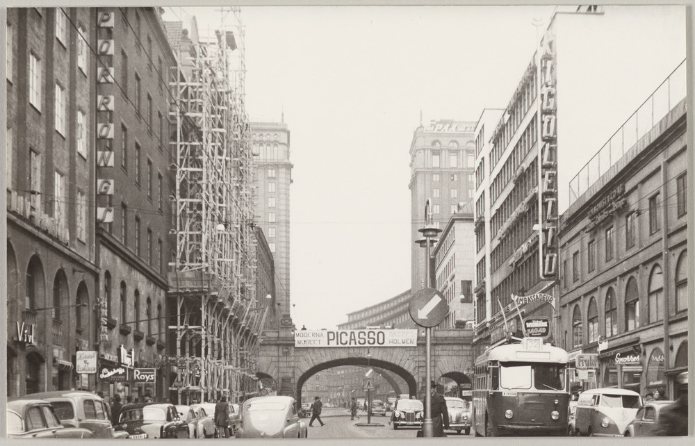 Une rue de Stockholm avec le panneau annonçant l'exposition "Guernica" au Nationalmuseum, en octobre-décembre 1956
