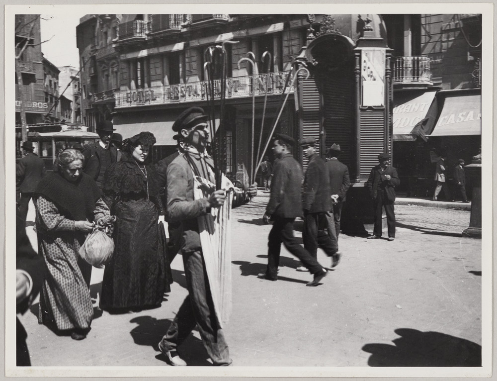 Vendeur de cannes devant l'Hotel Internacional, La Rambla dels Caputxins (del Centre), Barcelone, en 1907-08