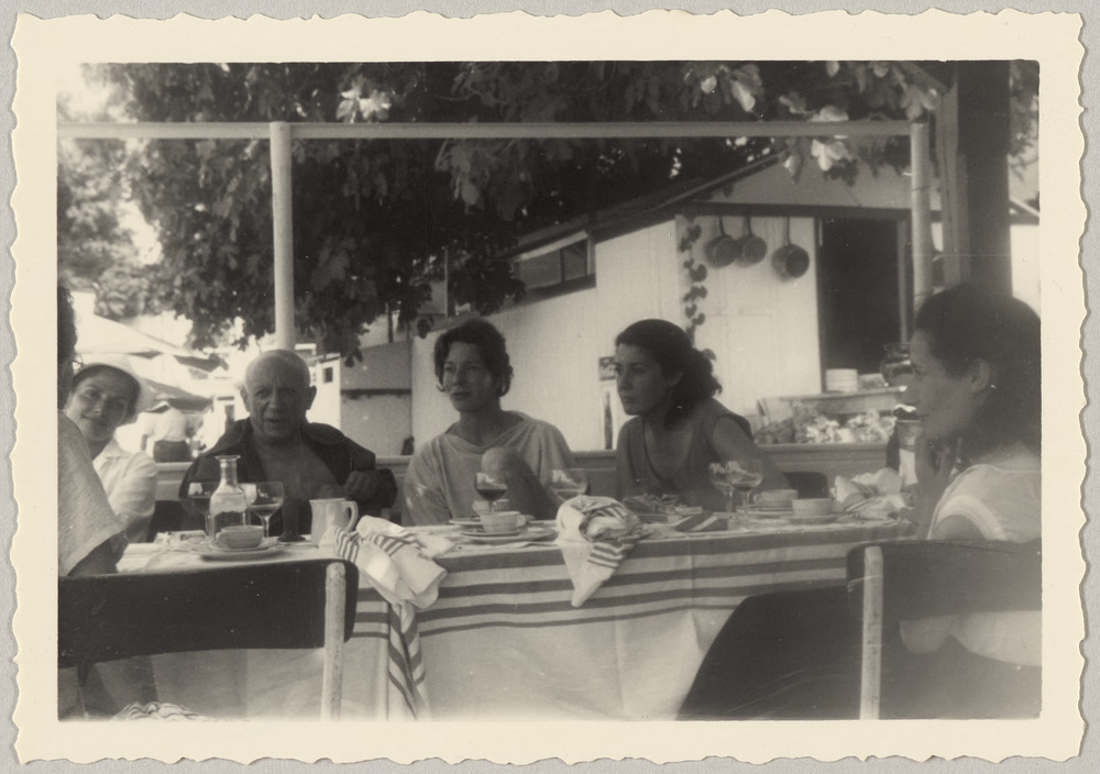 Véra Clouzot avec Pablo Picasso, [Bettina Graziani], Paule de Lazerme et Rosita Hugué de profil au restaurant, plage de la Garoupe, Antibes, en 1955