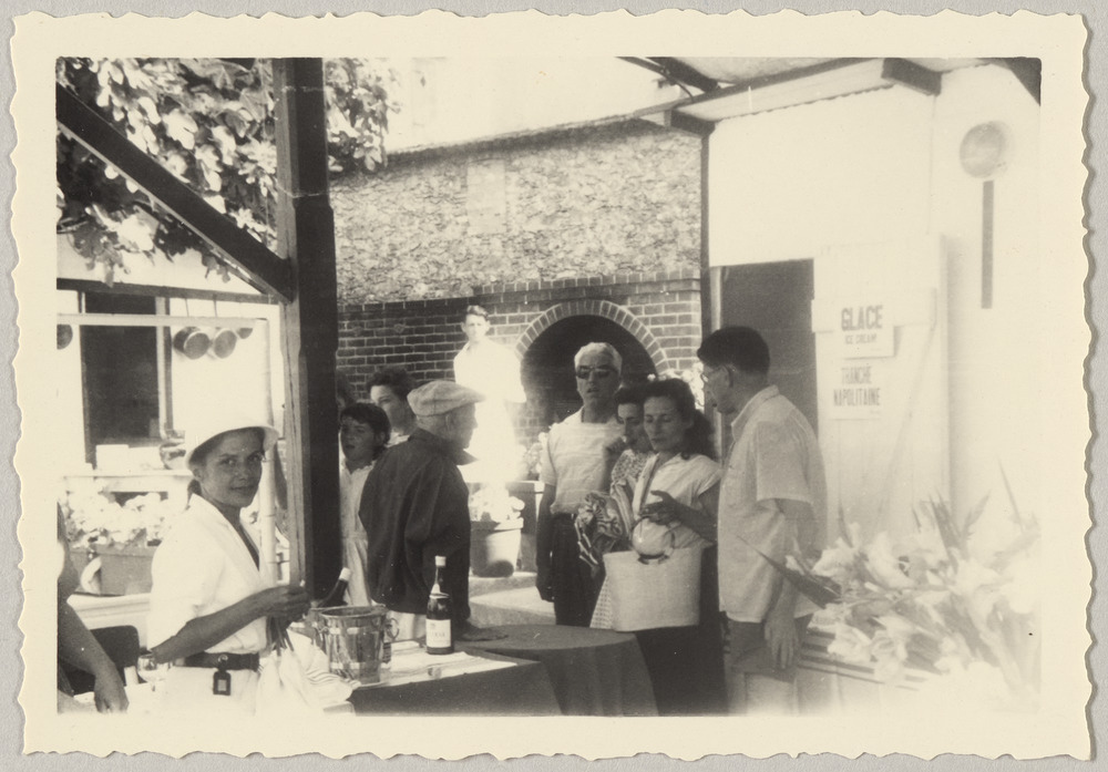 Véra Clouzot, Pablo Picasso avec Rosita Hugué, Roland Penrose, Jacqueline Roque, [Jacques de Lazerme] et Catherine Hutin au restaurant, plage de la Garoupe, Antibes, en 1955