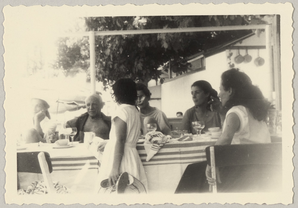 Véra Clouzot, Pablo Picasso, [Bettina Graziani], Paule de Lazerme, Rosita Hugué et Catherine Hutin de dos au restaurant, plage de la Garoupe, Antibes, en 1955
