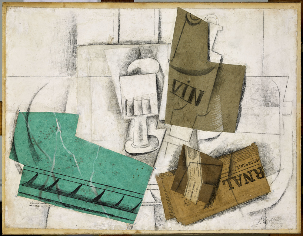 Copié dans le presse-papier :Verre, bouteille de vin, paquet de tabac, journal - Pablo Picasso - mars 1914 - https://cep.museepicassoparis.fr/explorer/verre-bouteille-de-vin-paquet-de-tabac-journal-mp1997-1