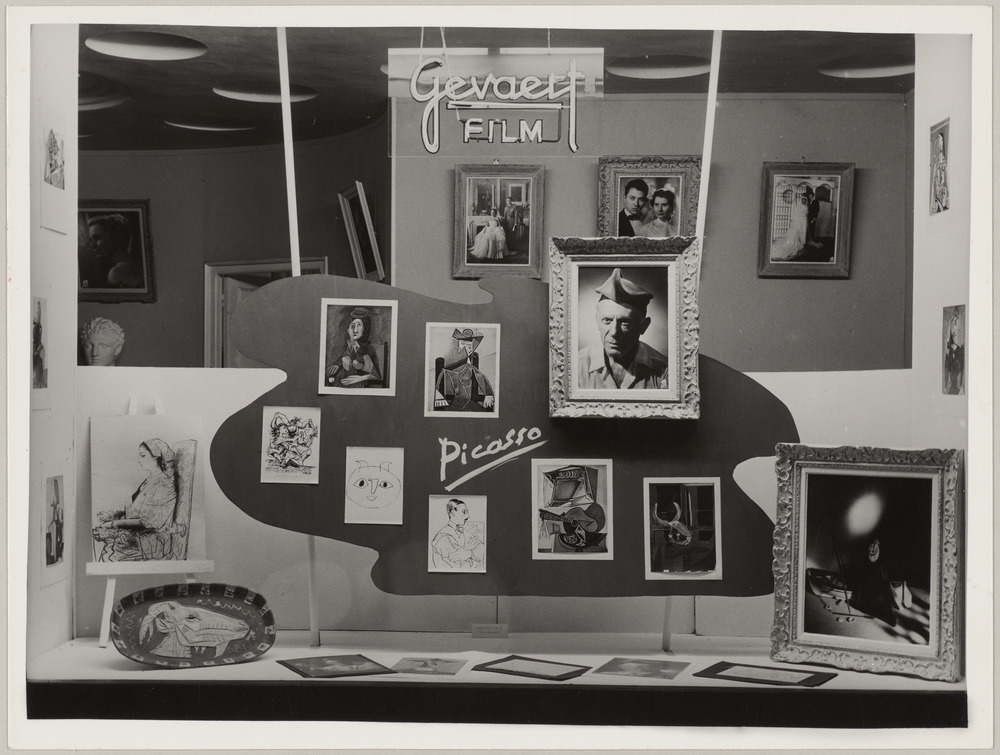 Vitrine du studio dédiée à Picasso (réalisée fin août 1954) avec la collaboration du peintre et décorateur Serge Kamké : reproductions d'oeuvre de Picasso, une céramique "Tête de Chèvre", le portrait photographique de Picasso à la barretina et le tirage d'une construction réalisée par Picasso.