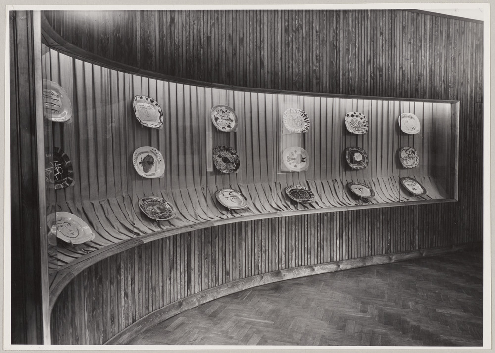 Vitrine d'une exposition de céramiques au musée Narodov, Varsovie, en 1949