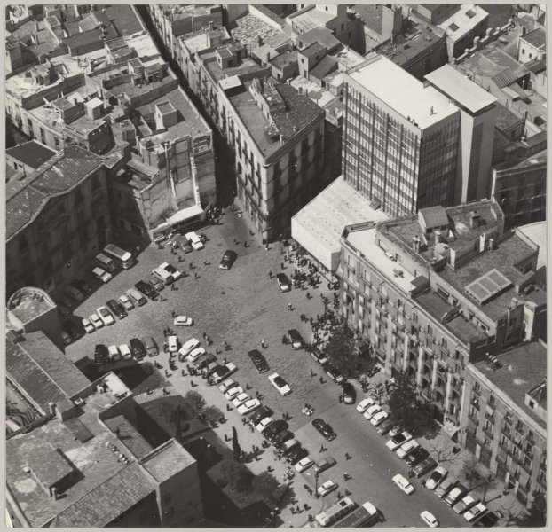 Vue aérienne de la plaça Nova de Barcelone avec le Collège des architectes de Catalogne, après 1962
