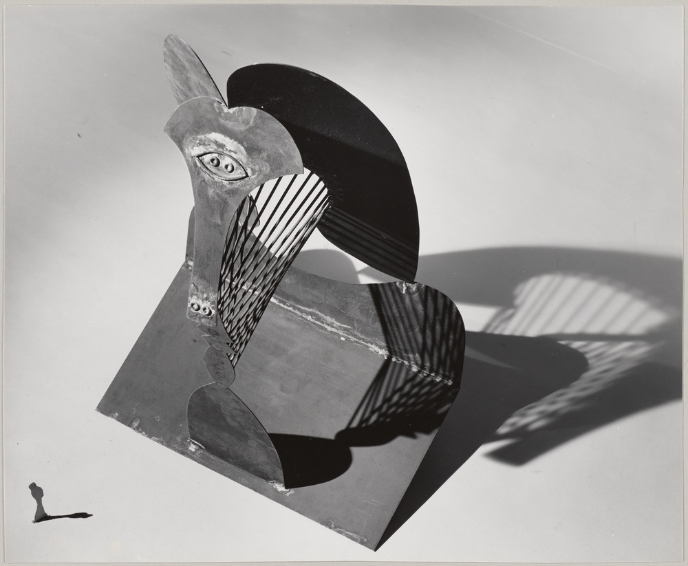 Vue de face de la "Tête" de la maquette de la sculpture du Chicago Civic Center, en acier soudé, Mougins, 1962-1964