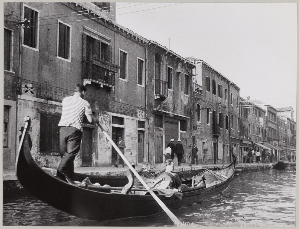 Vue de maisons au bord de l'eau devant lesquelles passe une gondole, [Venise, Italie], [vers 1967]