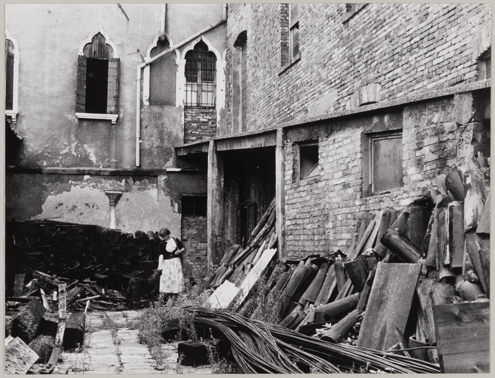 Vue des abords d'une maison devant laquelle sont entreposées des tuiles, [Venise, Italie], [vers 1967]