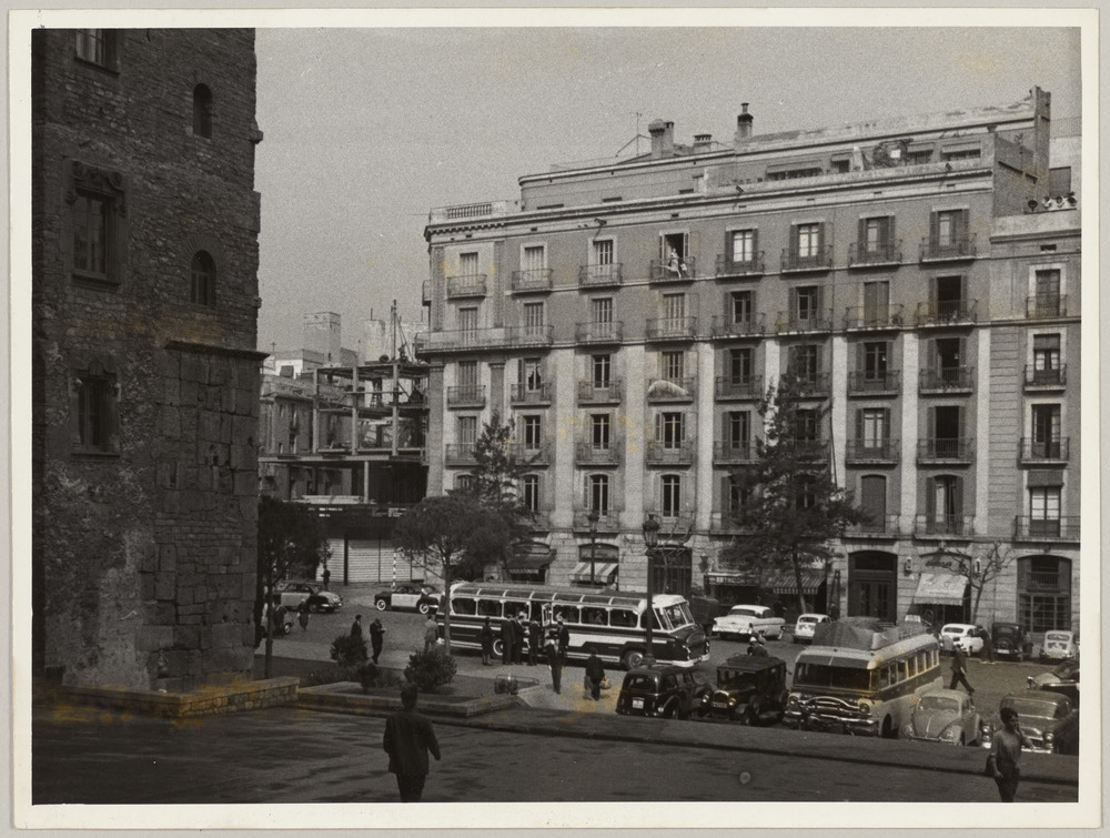 Vue du chantier du Collège des architectes de Catalogne à Barcelone depuis la Pla de la Seu, en 1960-62