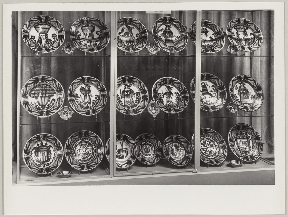 Vues de salles d'un musée espagnol probablement barcelonais d'art traditionnel espagnol (faïences, meubles, azulejos...) : salle VII Art Catalan XVIIe, plats