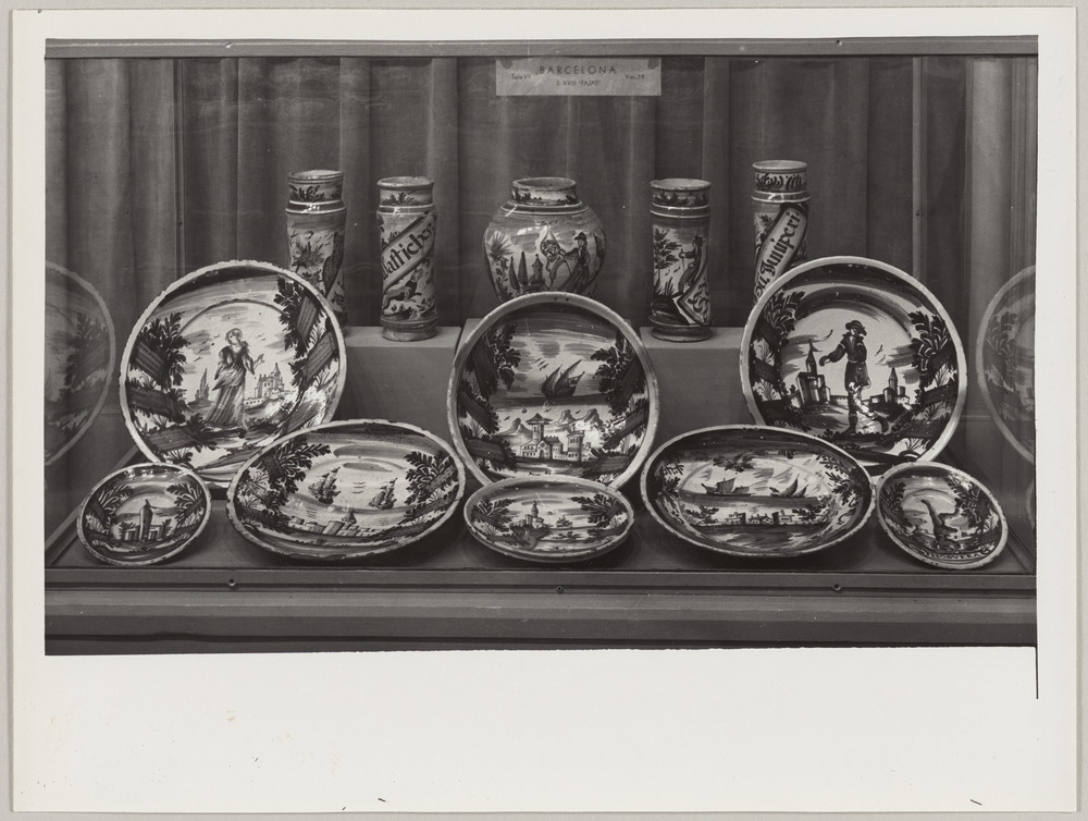 Vues de salles d'un musée espagnol probablement barcelonais d'art traditionnel espagnol (faïences, meubles, azulejos...) : salle VII Art Catalan XVIIIe