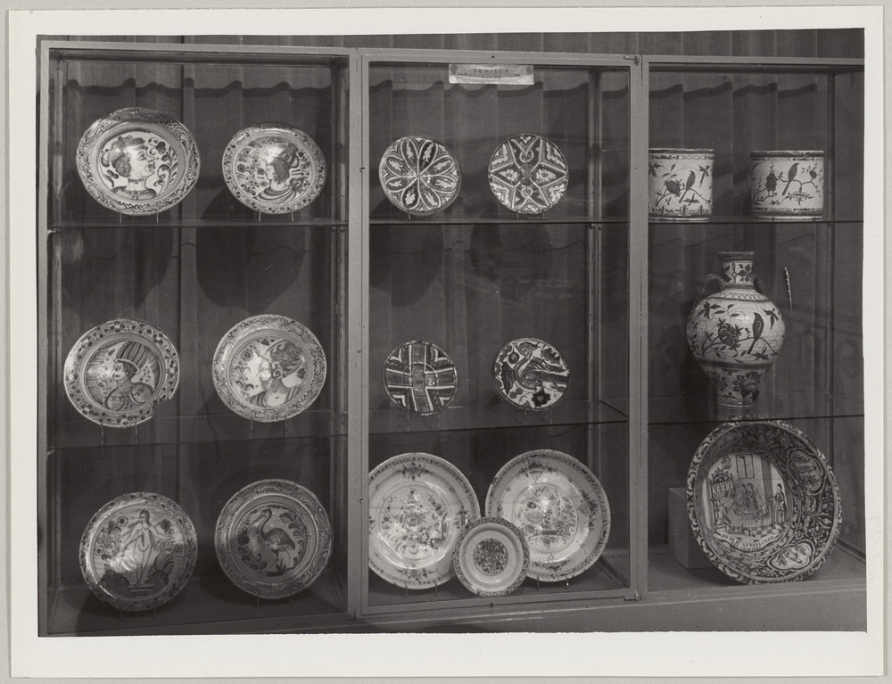 Vues de salles d'un musée espagnol probablement barcelonais d'art traditionnel espagnol (faïences, meubles, azulejos...) : salle X, plats. Séville XIVe au XVIIIe