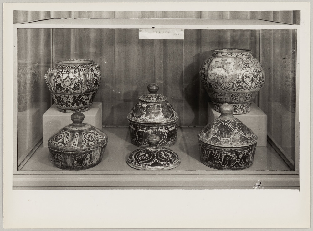 Vues de salles d'un musée espagnol probablement barcelonais d'art traditionnel espagnol (faïences, meubles, azulejos...) : salle XI, vases "Ternel"