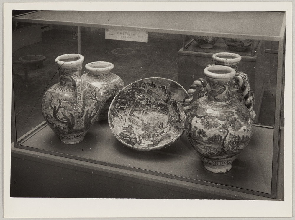 Vues de salles d'un musée espagnol probablement barcelonais d'art traditionnel espagnol (faïences, meubles, azulejos...) : salle XII Castille, plat et vases