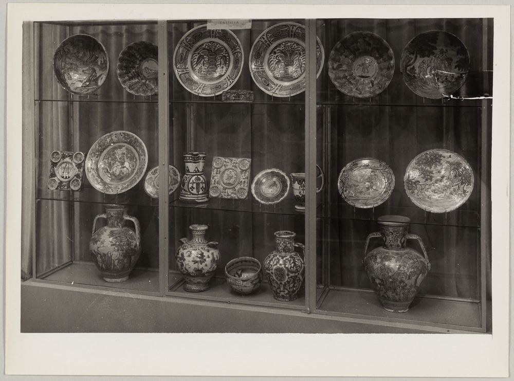 Vues de salles d'un musée espagnol probablement barcelonais d'art traditionnel espagnol (faïences, meubles, azulejos...) : salle XII Castille, plats et vases XVIIIe