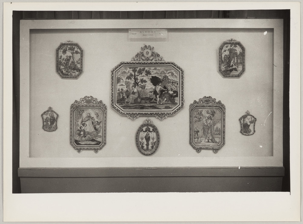 Vues de salles d'un musée espagnol probablement barcelonais d'art traditionnel espagnol (faïences, meubles, azulejos...) : salle XIII Alcora "première époque"