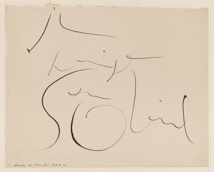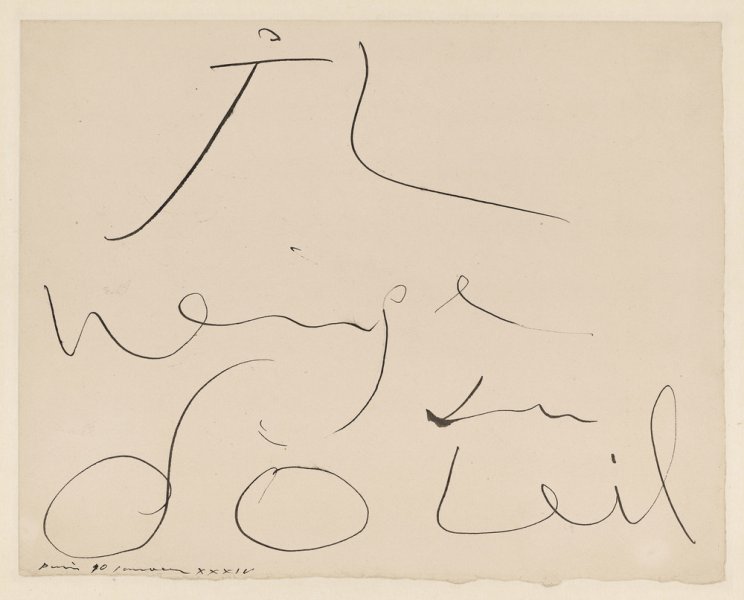 La propension de Picasso pour l’écriture et la littérature remonte à l’enfance. Dans ses premiers carnets de dessins, l’artiste consigne son amour pour des écrivains comme Alfred de Vigny et Joan Maragall. Aux alentours de 1912, mots et lettres entrent dans ses compositions cubistes à la fois comme des « textures optiques », pour reprendre la formule de Michel Butor, mais aussi pour leur sens pluriel. Le fragment syllabique « jou » pourrait alors signifier « journal », « jour » ou encore « jouer ». La dimension calligraphique de l’écriture poétique s’annonce déjà dans des expérimentations entre le visible et le lisible : dans « Il neige au soleil » (10 janvier 1934), l’artiste fait varier une même phrase sur des feuilles de papier d’Arches, déployant l’écriture linéaire pour la transformer en figure.
